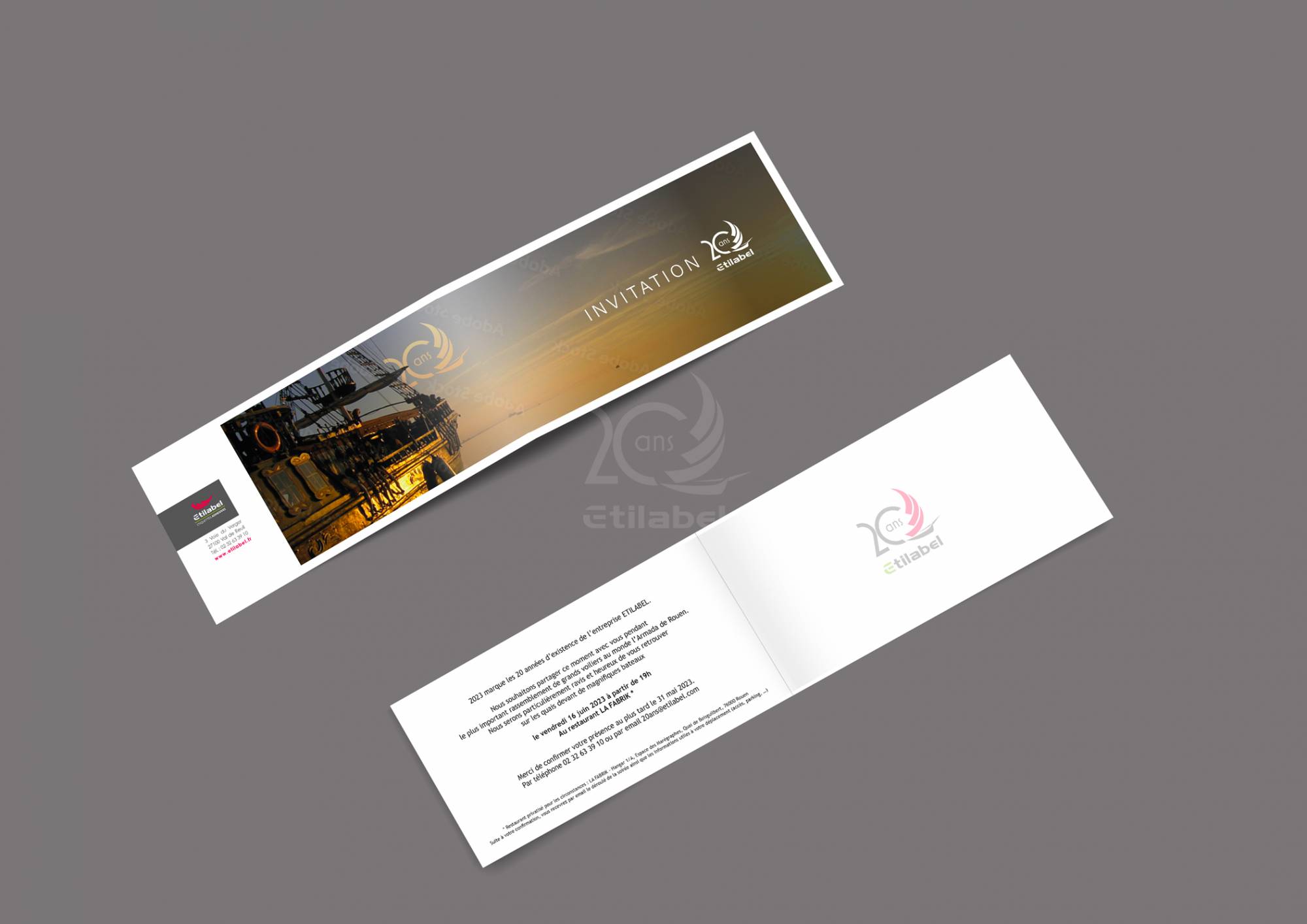 Pour fêter comme il se doit les 20 ans de l'entreprise Etilabel, le spécialiste de l'étiquette adhésive. Etilabel nous a missionné pour créer et organiser, en juin 2023, pendant le plus important rassemblement de grands voiliers au monde : l'armada de Rouen, un évènement sur-mesure unique. Afin de remercier les clients, les collaborateurs et renforcer l'image de l'entreprise, nous avons créé des documents et goodies spécifiques à l'évènement et réalisé un film institutionnel.